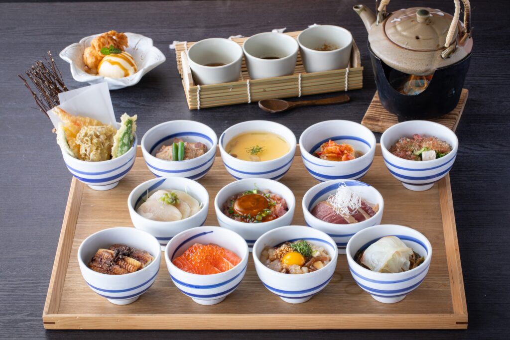 烏賊や平貝、鯛の昆布〆、本鮪の湯引き漬けなど、趣向を凝らした7種のミニ海鮮丼が主役の御膳。小ぶりながらも一つひとつに主役の魚介を盛り込み、漬け・炙り・卵黄漬けなど、それぞれ異なる味わいをご堪能いただけます。さらに、茶碗蒸し・天婦羅・金星豚の角煮を添え、締めには茶漬け出汁をご用意。最後の一口まで味の変化をお楽しみいただけます。