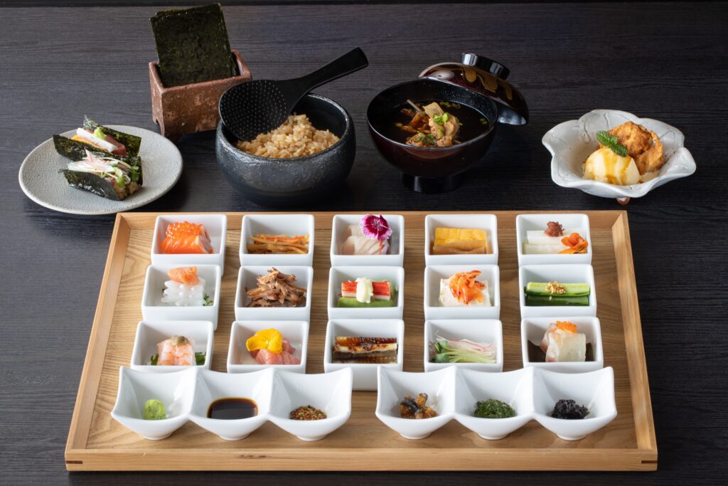 15種の具材をお好みで組み合わせ、ご自身で巻いて楽しむセルフスタイルの手巻き鮨御膳。唐津湾・玄界灘の魚介を中心に、鯛・鰤・鮪・穴子・海老などの海の幸に加え、金星豚の時雨煮、胡瓜の浅漬け、金平牛蒡などもご用意しています。魚介を贅沢に味わう組み合わせから、肉や野菜を織り交ぜた組み合わせまで、その日の気分で自由にお楽しみいただけます。
